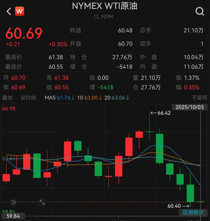 国际油价小幅收涨,结束连跌。周五,NYMEX WTI原油上涨0.35%。