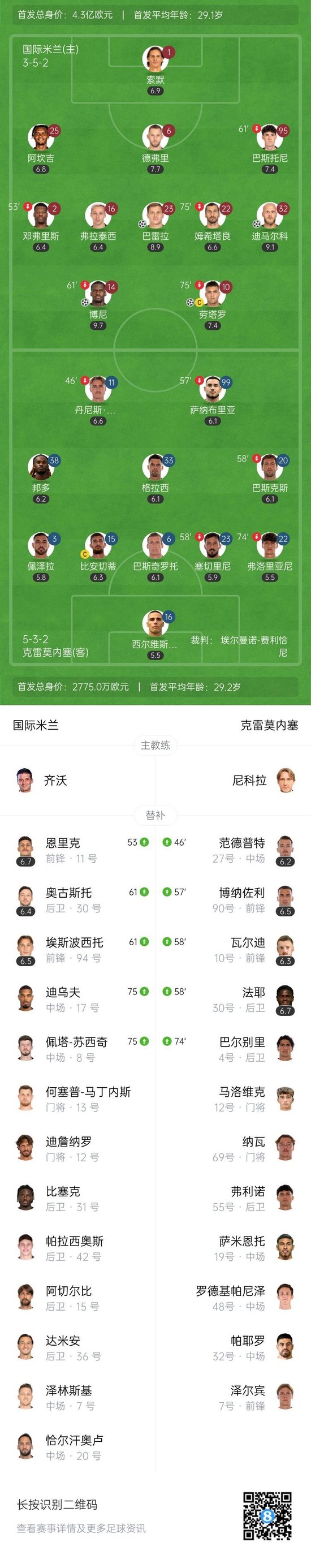第87分钟,迪乌夫后场丢失球权,范德普特左路传中,后门柱位置博纳佐利包抄破门!克雷莫内塞扳回一球1-4国际米兰↓