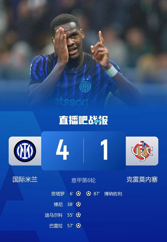 第57分钟,又是博尼的助攻!禁区前沿一脚小短传,巴雷拉得球直面门将推射破门!博尼1射3传独造4球!国际米兰4-0领先克雷莫内塞↓