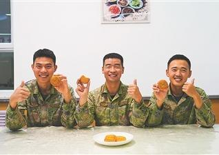 月是故乡明,月饼还是儿时味道更甜美。“这是镇上的老字号月饼,是我小时候的‘最爱’。”刘钰池在一旁向战友们介绍。