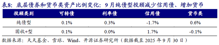 从底层债券比例变化来看,9月调仓纯债型投顾和固收+型投顾策略有所区别,纯债型投顾产品整体减少信用债、增加利率债和货币,固收+型投顾产品增加信用债。其中9月调仓纯债型投顾产品底层资产中信用债占比减少1.7%,货币增加0.6%。