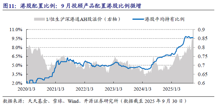 9月,投顾产品配置港股比例上升,港股配置比例均值从9.59%增加至9.64%。