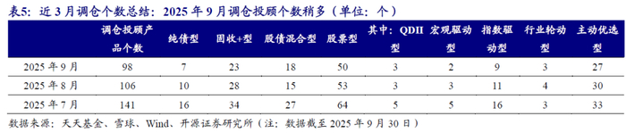 整体来看,2025年9月投顾产品调仓数量稍多,共有98个基金投顾产品进行调仓,其中纯债型、固收+型、股债混合型和股票型投顾产品数量分别为7个、23个、18个和50个。
