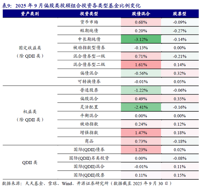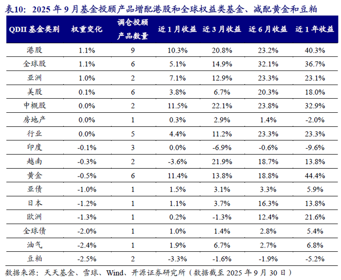 统计QDII型和宏观驱动型投顾调仓,2025年9月基金投顾产品减配黄金和豆粕,增加港股和全球权益类基金。筛选宏观驱动和QDII型基金投顾产品,2025年9月该类基金投顾产品增配标的主要包括港股(+1.1%)和全球权益(+1.1%)基金,减配标的主要包括黄金(-0.5%)、豆粕(-2.5%)基金。