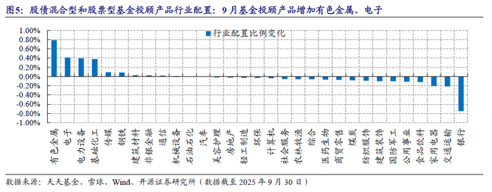 从股债混合型和股票型基金投顾产品行业配置变化来看,9月投顾产品整体减少银行,增加有色金属、电子等行业。增配比例最高的行业为有色金属(+0.79%)和电子(+0.41%),减配比例最高的行业为银行(-0.75%)。
