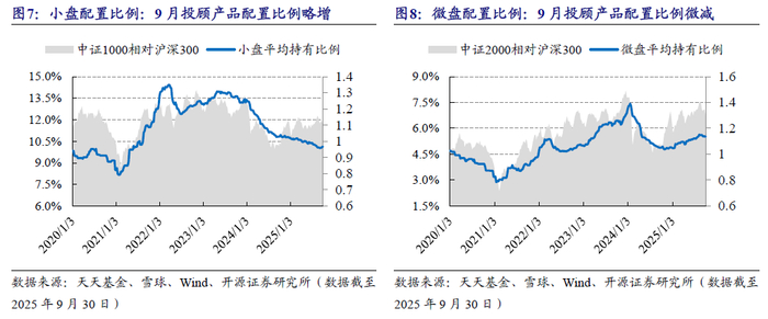 对于风格配置,本节考察股票类投顾产品配置红利类基金和底层资产中的小盘以及微盘股票比例。9月投顾产品持仓中红利基金比例下降,底层资产中小盘类股票比例略微上升。9月,红利基金配置比例均值从5.70%减少至5.58%。
