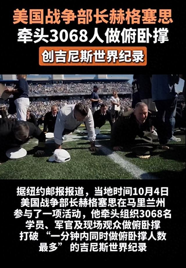 美国战争部长赫格塞思牵头3068人做俯卧撑,创吉尼斯世界纪录。