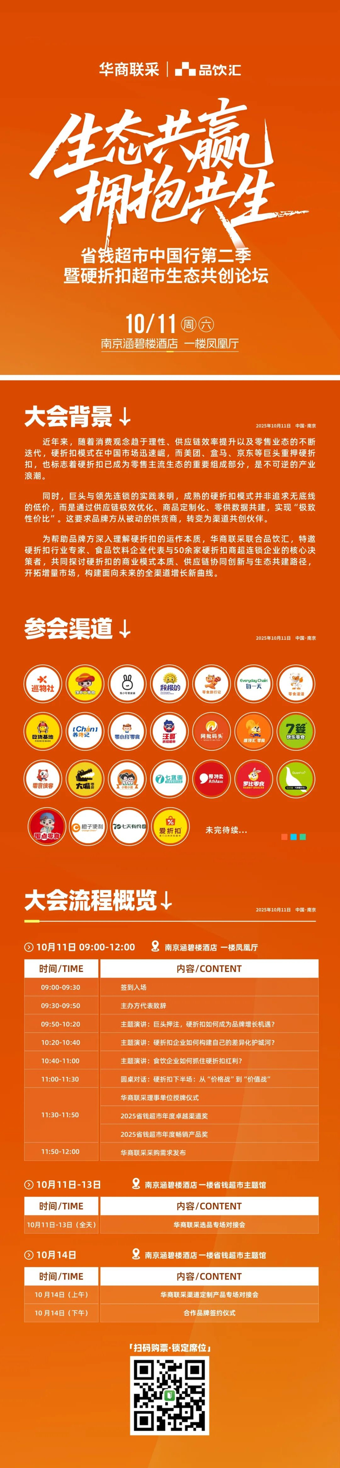 而行业正从单打独斗转向生态共建——10月11日,华商联采与品饮汇将举办“省钱超市中国行第二季暨硬折扣超市生态第二季暨硬折扣超市生态共创论坛”,聚集50余家连锁企业核心决策者,分享供应链运营之道,探讨供应链协同创新与生态共建路径。这场以“生态共赢·拥抱共生”为主题的会议,标志着行业进入深度整合期。