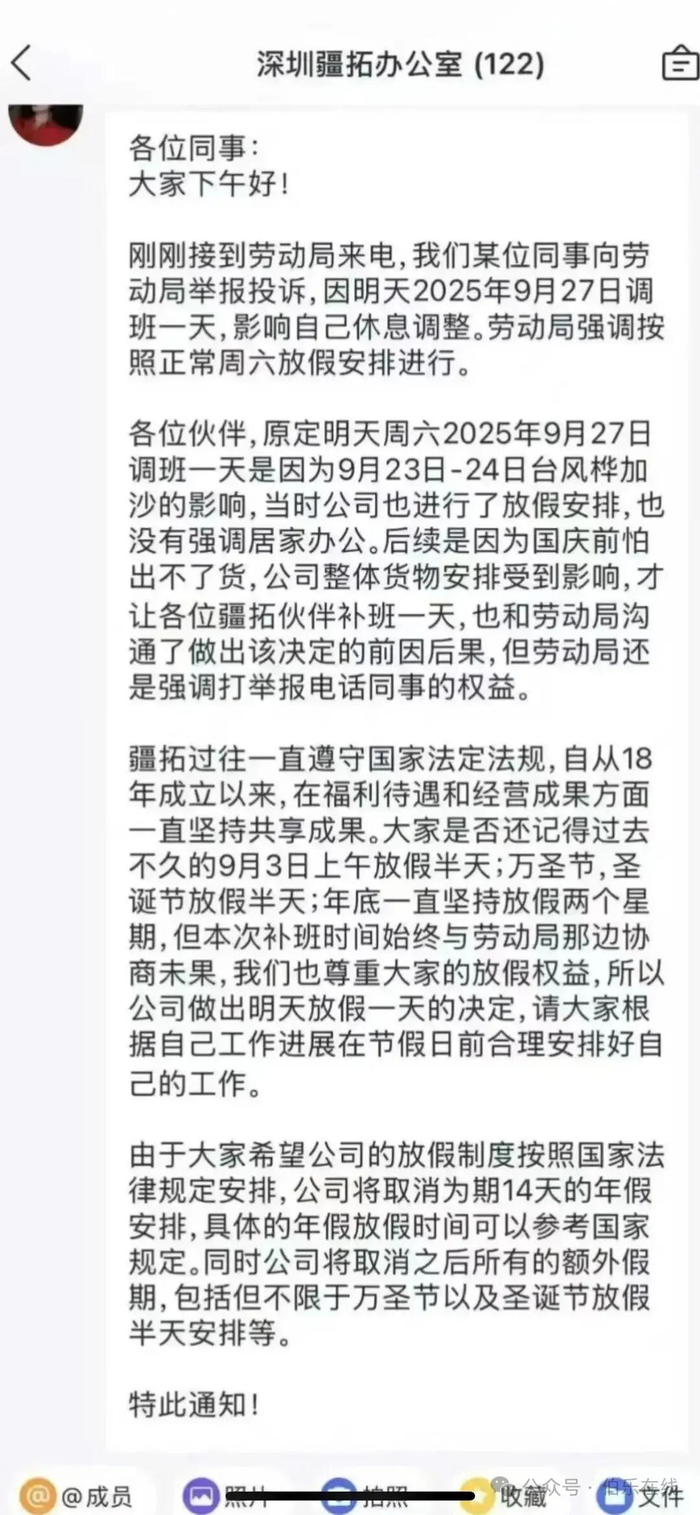 通知中称,疆拓过往一直遵守国家法定法规,自从 2018 年成立以来,在福利待遇和经营成果方面一直坚持共享成果。9 月 3 日(中国人民抗日战争胜利纪念日)上午放假半天;一些非法定节假日也放假半天;年底一直坚持放假两个星期,但本次补班时间始终与劳动局那边协商未果,我们也尊重大家的放假权益,所以公司做出明天(27 日)放假一天的决定。