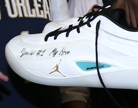有爱的锡安,除了在球鞋上签名之外,还附上了对小球迷的敬意,他还签上了“My hero(我的英雄)”字样。