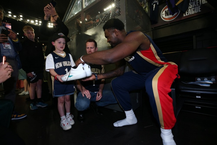 直播吧10月6日讯 在澳大利亚进行季前赛的锡安,在比赛中将自己亲穿球鞋签名送给了一位小球迷Theodore。Theodore刚刚战胜了癌症。