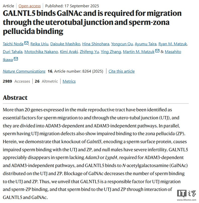 IT之家 10 月 5 日消息,据新华社今日报道,熊本大学和大阪大学参与的国际团队发现了一种名为 GALNTL5 的蛋白质,可能是诊疗男性不育的关键所在。此外,该研究成果还有望用于研发新型避孕药。