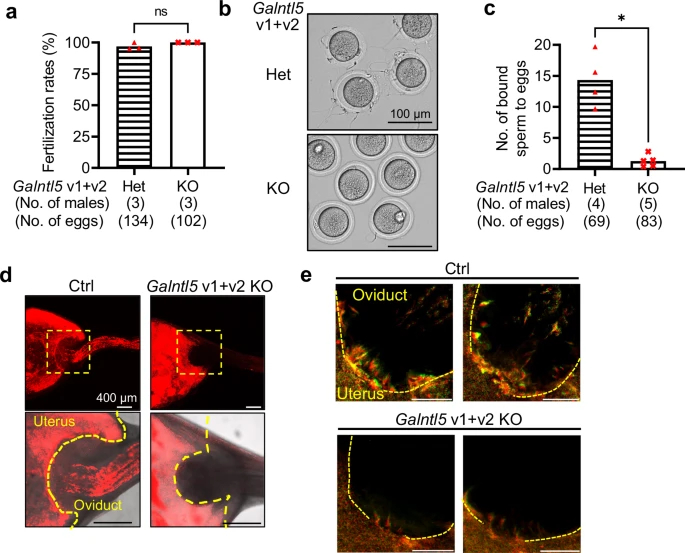 研究显示,在雌性实验鼠子宫和输卵管的连接处,以及包裹卵子起保护作用的卵子透明带中,都存在被一种名为 N-乙酰半乳糖胺的物质修饰的蛋白质,精子需要其表面的 GALNTL5 蛋白质与之结合,才能成功通过这些地方并使卵子受精。
