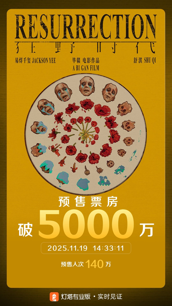 据灯塔专业版实时数据,截至11月19日14时33分,影片《狂野时代》预售总票房突破5000万。该片将于11月22日上映。