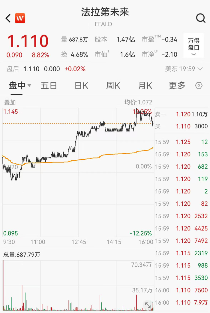 美东时间11月18日收盘,FF(FFAI.O)股价报1.11美元/股,涨8.82%,总市值为1.63亿美元,年内股价跌超50%。