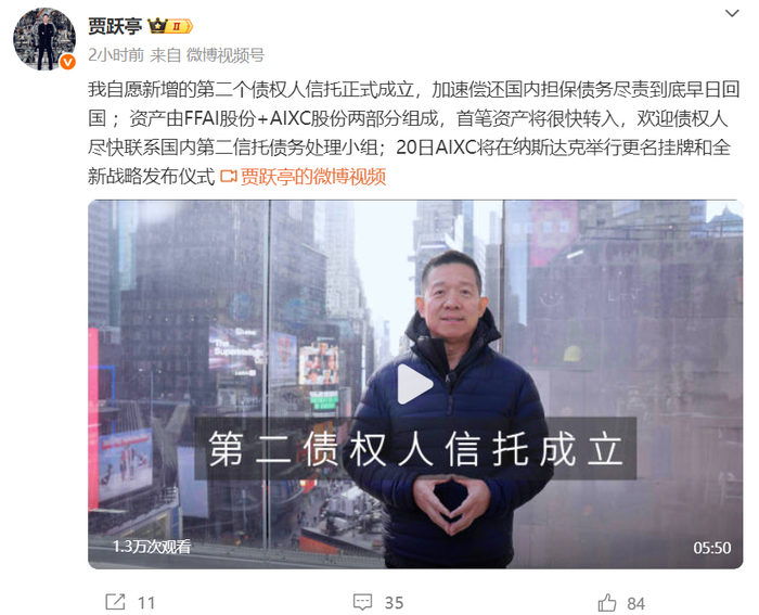11月19日上午,贾跃亭在微博发布出镜视频,称生命中最重要的事情之一是“早日还债回国”。他将继续全力推动法拉第未来(以下简称“FF”)和AIXC成功,“从而让国内债权人尽早得到实质性的回报”。