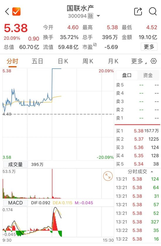 11月19日,水产股午后快速拉升。截至发稿,国联水产(300094)“20cm”涨停,开创国际、中水渔业、大湖股份、百洋股份、东方海洋等多股涨停。