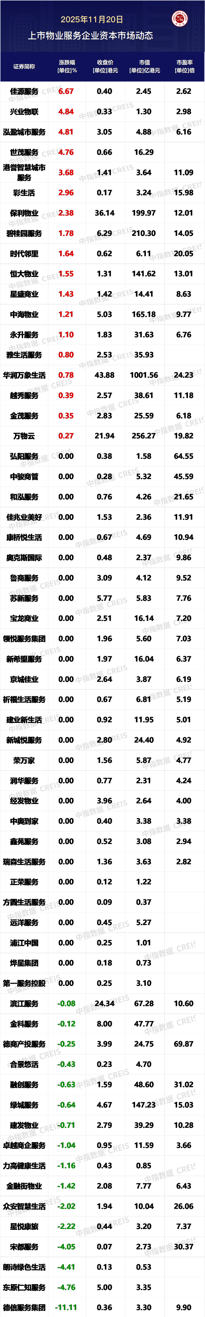 11月20日,恒生指数,收盘上涨4.92点,涨幅约为0.02%,报收25835.57点。今日61家港股上市物业服务企业中18家上涨。佳源服务涨幅为6.67%,位列今日港股物业服务板块第一位。