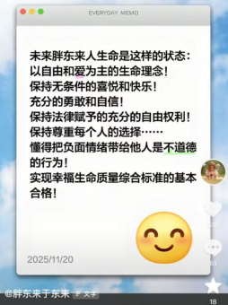 今天上午,胖东来商贸集团董事长于东来在网络社交平台发声,“未来胖东来人生命是这样的状态:以自由和爱为主的生命理念!保持无条件地喜悦和快乐!充分的勇敢和自信!保持法律赋予的充分的自由权利!保持尊重每个人的选择……懂得把负面情绪带给他人是不道德的行为!实现幸福生命质量综合标准的基本合格!”
