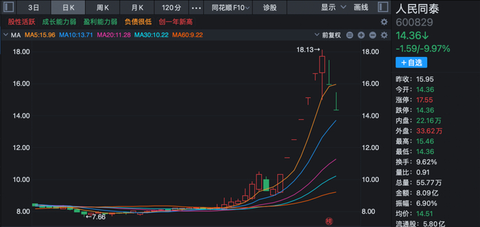 另一只热门股人民同泰再度跌停。继19日跌停后,20日人民同泰开盘跌停,盘中一度开板,但最后跌停至收盘。此前人民同泰曾六连板,7个交易日大涨88.71%。