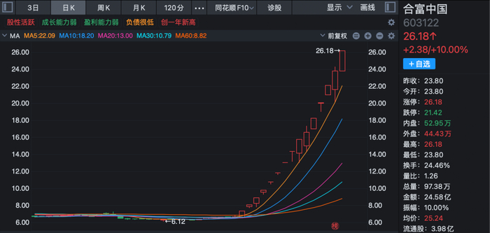 停牌核查后复牌的合富中国再度受资金热捧,盘中封死涨停板,截至收盘,报26.18元/股。
