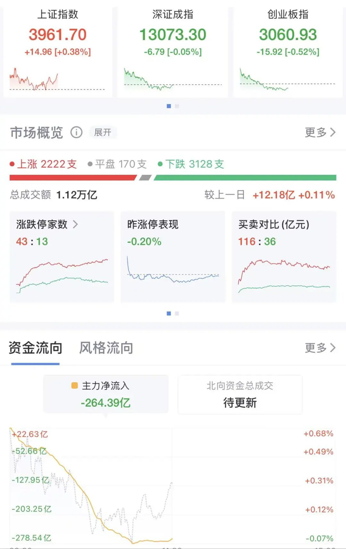 11月20日,市场早盘高开低走,创业板指跌0.52%,此前一度涨超1.5%。截至收盘,沪指涨0.38%,深成指跌0.05%,创业板指跌0.52%。