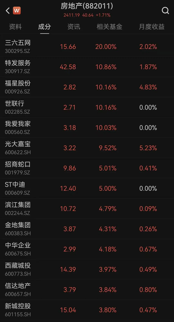 接近午间收盘,A股地产板块突然拉升,我爱我家直线涨停,特发服务、福星股份、世联行、光大嘉宝、深深房A、万科A等纷纷冲高。
