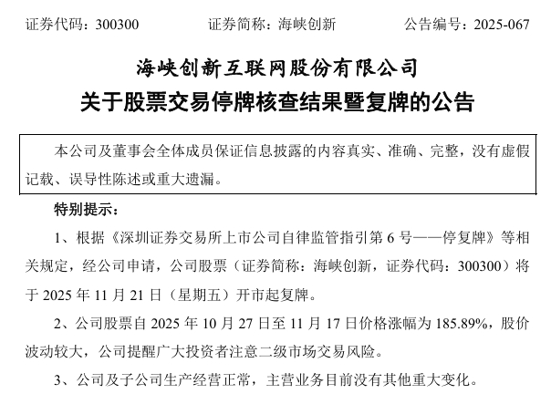 海峡创新(300300)11月20日晚间公告,此前,公司就股票交易波动情况进行了停牌核查。鉴于相关自查工作已完成,根据《深圳证券交易所上市公司自律监管指引第6号——停复牌》等相关规定,经公司申请,公司股票(证券简称:海峡创新证券代码:300300)将于2025年11月21日(星期五)开市起复牌。