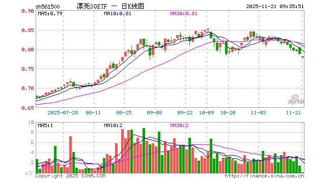 11月21日,漂亮50ETF(561500)开盘跌0.89%,报0.781元。漂亮50ETF(561500)重仓股方面,东方财富开盘跌0.79%,恒瑞医药跌0.49%,阳光电源跌4.14%,迈瑞医疗跌0.43%,豪威集团跌1.31%,万华化学跌0.70%,福耀玻璃跌0.42%,金山办公跌0.83%,同花顺跌1.22%,天孚通信跌5.67%。