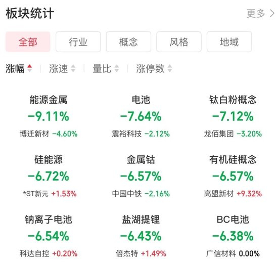 前期热门板块今日大幅调整,有色金属、电池相关等多个板块大跌。截至收盘,能源金属大跌9.11%,电池跌7.64%,硅能源、有机硅概念、钠离子电池、盐湖提锂等多个板块跌超6%。
