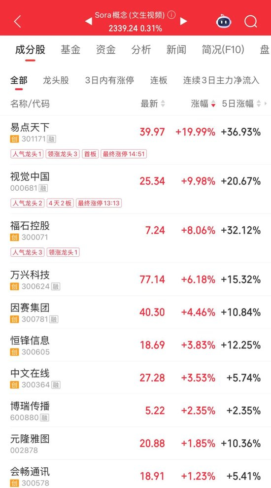 Sora概念(文生视频)板块部分个股午后大涨。易点天下“20CM”涨停;视觉中国涨停,走出“4天2板”;福石控股涨超8%。