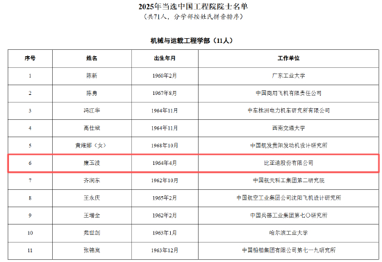 11月21日,中国工程院2025年院士增选当选院士名单公布。中国工程院2025年院士增选共选举产生71位中国工程院院士。其中,两家深交所上市公司核心人员上榜,宁德时代首席科学家吴凯、比亚迪首席科学家廉玉波等在列,意味着吴凯、廉玉波正式当选中国工程院院士。