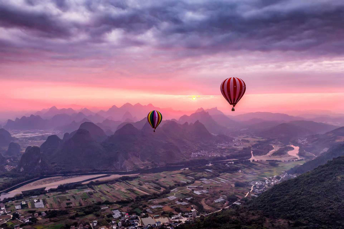 小寒虽冷春将近,旭日初升暖渐回。晨雾轻拢漓江,朝霞把天际晕染成温柔的粉橘色,热气球悠然飘荡在喀斯特峰林之上。江流如练,绕着青黛山峦蜿蜒流淌,田畴村落纵横交错,漓江的晨,充满了诗情画意。(阳朔县纪委监委供 陈彦/摄)