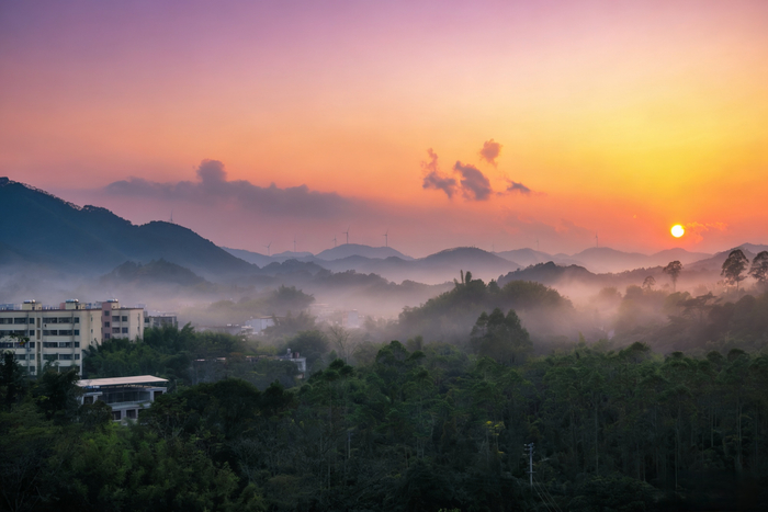 小寒时节,暮色中的北流市平政镇,残阳如砚,将漫天云霞研成橘红、绛紫,层层晕染峰峦。山影横斜,冷雾与暖霞相拥,草木凝霜却缀着金辉。(北流市纪委监委供 李家辉/摄)
