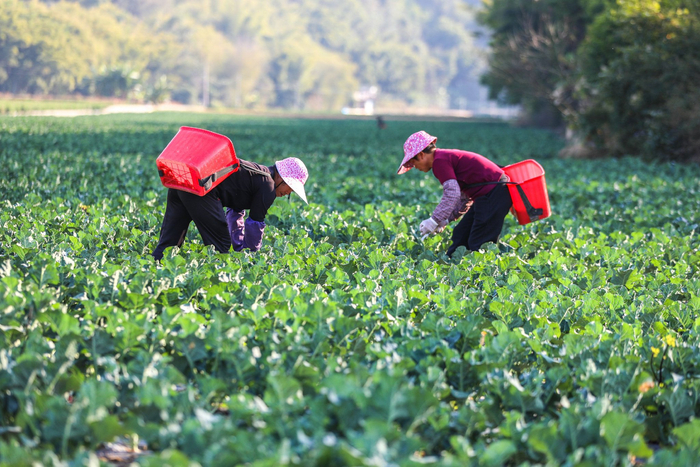 小寒至,冬日蔬菜采摘忙。在梧州市龙圩镇大坡镇交村村蔬菜种植基地,农民正忙着采摘蔬菜,给冬季市场供应新鲜的蔬菜。(梧州市纪委监委供 林志清/摄)