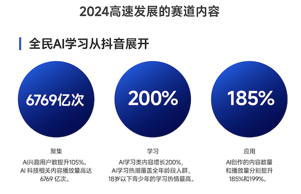 AI的创造力在抖音充分展现,通过AI创作的内容数量和观看量分别实现185%和199%的快速增长,AI正逐渐成为内容创作的新范式。