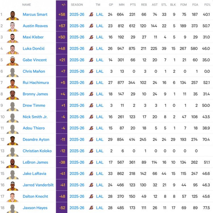 凭借今日+3的正负值,斯玛特赛季总正负值为+58,超越了里夫斯的+57暂居湖人第一;克莱伯+50第3,东契奇+48第4。