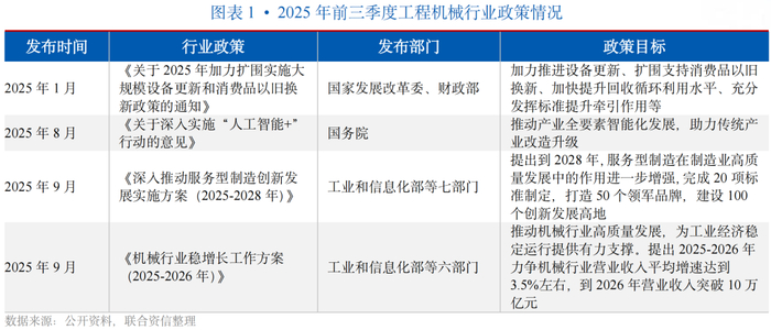 行业政策方面,2025年以来,工程机械行业相关产业政策逐步落地。2025年1月,国家发展改革委和财政部印发《关于2025年加力扩围实施大规模设备更新和消费品以旧换新政策的通知》,加力推进设备更新、扩围支持消费品以旧换新,重点支持高端化、智能化、绿色化设备的应用,同时政策配套了标准提升、循环利用等措施,将直接扩大工程机械行业下游需求,引导产业方向,规范和拓展现有市场。2025年8月,国务院印发《关于深入实施“人工智能+”行动的意见》,加快工业软件创新突破,将AI与工业互联网融合,推动工程机械装备从“功能机”向“智能体”演进。2025年9月,工业和信息化部等六部门联合印发《机械行业稳增长工作方案(2025-2026年)》,提出2025-2026年力争机械行业营业收入平均增速达到3.5%左右,到2026年营业收入突破10万亿元,该政策作为顶层设计,为包括工程机械在内的整个机械行业设定了明确的发展目标和工作方向。