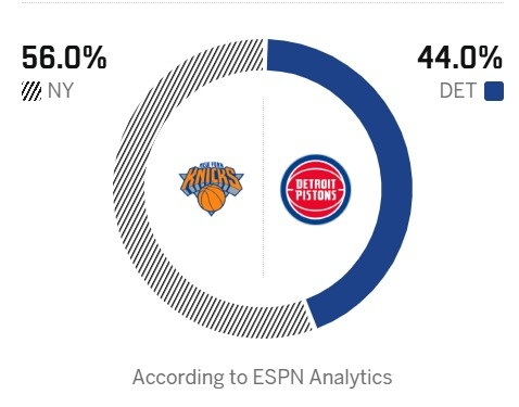 赛前ESPN给出了本场的获胜概率预测,主场的活塞为44.0%,客场的尼克斯56.0%。