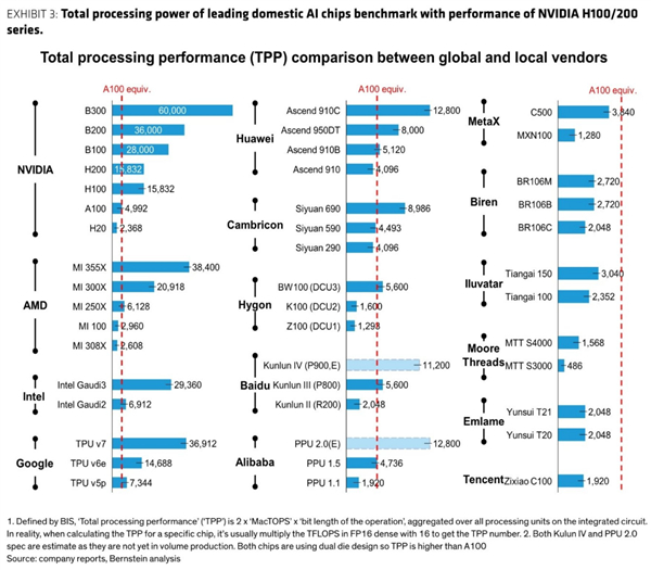 伯恩斯坦绘制了一份全球AI芯片的全景图,对比了多家厂商的TPP性能密度水平,基准线则是NVIDIA的A100显卡,这是一款6年前的产品了,但很多AI大模型还是在A100上训练的。