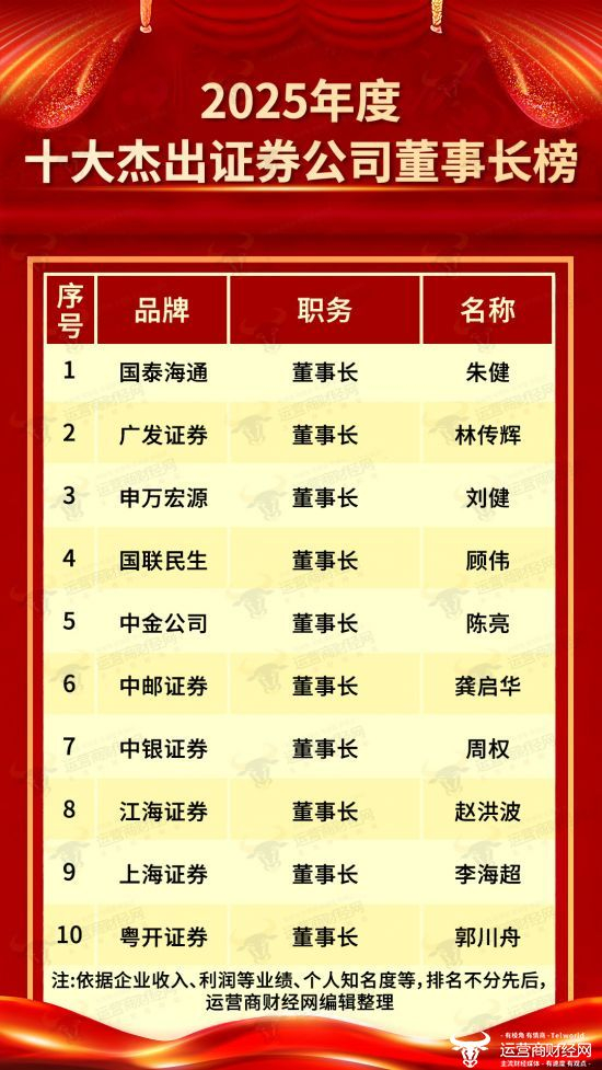 近期,国内知名财经媒体——运营商财经网放出消息表示将打造2025年度金融企业杰出榜,引起业内外广泛关注。当下,由运营商财经网独家打造的“2025年度十大杰出证券公司董事长榜”具体名单正式出炉!都有哪些高管上榜?