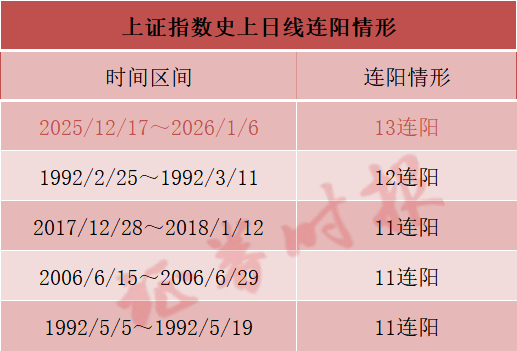1月6日,上证指数收盘大涨1.5%,再度收出阳线,实现日线13连阳,创出该指数史上最长连阳纪录。