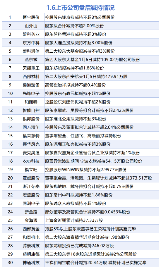 据统计,1月6日,暂无A股上市公司披露增持情况。包括恒宝股份、山外山、东方中科、盟科药业、盛科通信、天能重工、燕东微、西部材料、蜀道装备、先锋电子、和而泰、智能自控、银邦股份、四方精创、福莱蒽特、振华风光、麦克奥迪、农心科技、福立旺、亚威股份、浙江荣泰、宏盛股份、同洲电子、新金路、西部黄金、金海通、和泰机电、腾景科技、神通科技、药明康德在内的30家A股上市公司披露减持情况。