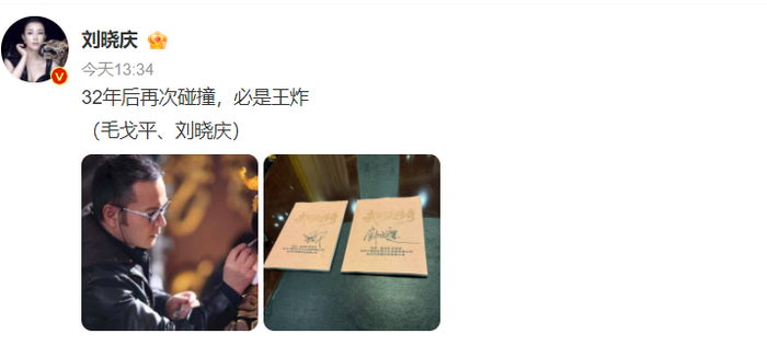 1月6日,演员刘晓庆在微博晒出两张照片,并配文“32年后再次碰撞,必是王炸(毛戈平、刘晓庆)”。