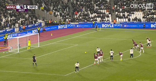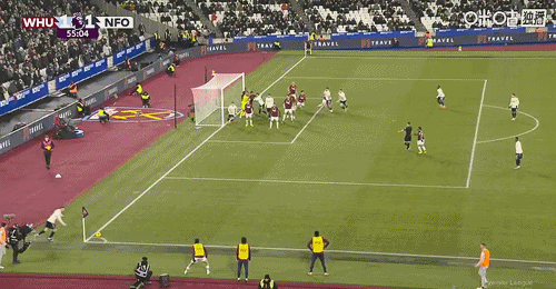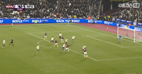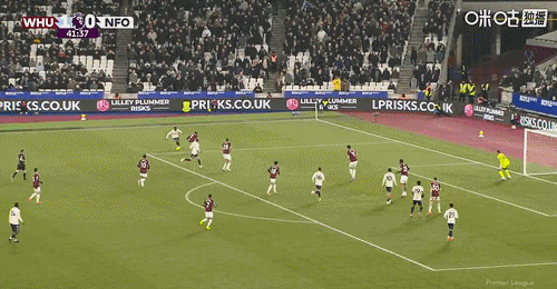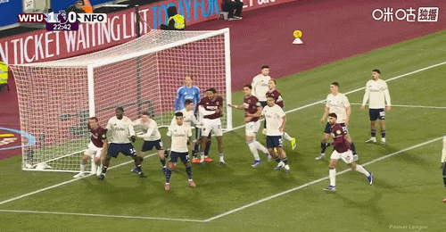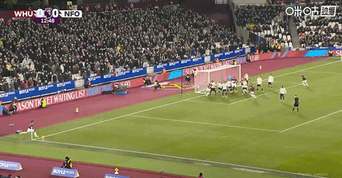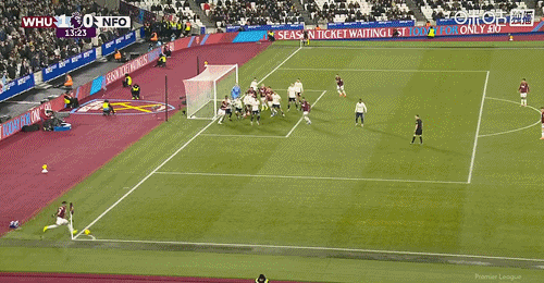 第13分钟,西汉姆左侧角球开出,禁区内前点双方多人争顶都没能顶到,门前穆里略解围不慎自摆乌龙,西汉姆1-0领先↓