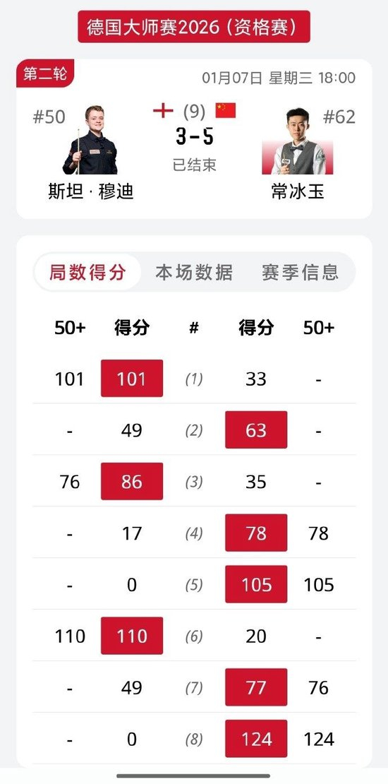 穆迪轰出一杆101和一杆110,常冰玉轰出一杆105和一杆124。