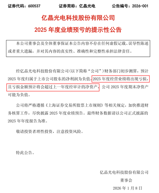 1月7日晚间,亿晶光电发布《2025年度业绩预亏的提示性公告》,公司预计2025年亏损,且将会把经审计的净资产亏没。