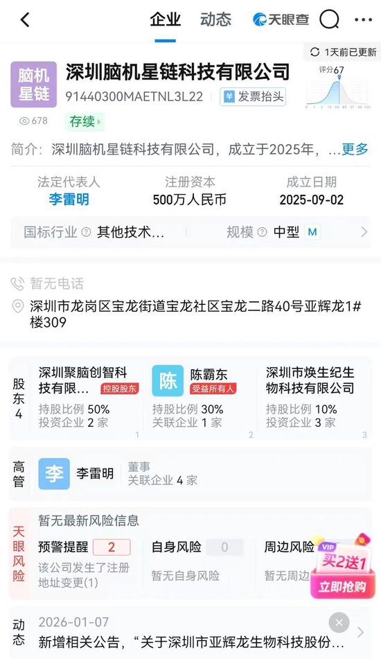 此外,21 世纪经济报道记者还从天眼查数据发现,脑机星链的地址正位于“亚辉龙1#楼309”。