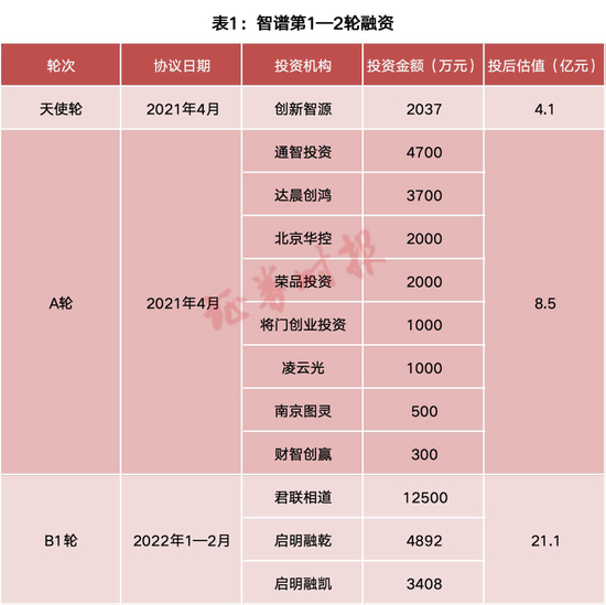 此次决定让智谱在Chat GPT发布前完成3轮融资。前两轮均发生于2021年4月——天使轮中,智源研究院通过全资子公司北京创新智源科技有限公司,以价值2037万元的知识产权完成注资,不难猜测,这个知识产权正是智谱大模型技术的核心底座。A轮的参与者则包括达晨财智、华控基金、将门创投等机构,合计为智谱注入了1.52亿元的早期发展资金,投后估值8.5亿元。