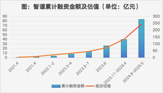 2022年12月Chat GPT发布后,智谱也相继跟进了智谱清言、基座大模型GLM-4等产品,并同步迎来融资爆发期。机构的蜂拥而至,令智谱的估值从B1轮的21.1亿元飙升至IPO前的243.8亿元,其累计斩获的83.6亿元融资中,超九成集中在2023—2025年这三年间。